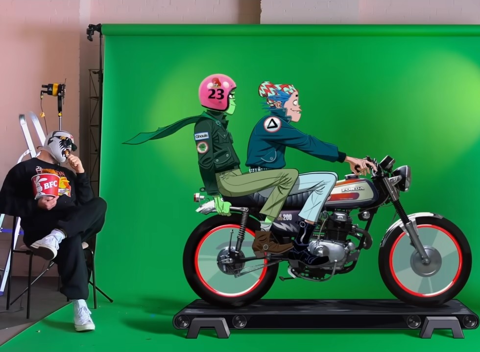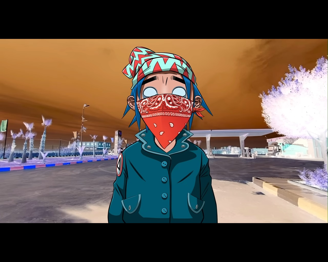 Gorillaz singer 2-D wearing a red handkerchief mask at the end of “Aries”, warning everyone to be safe during the COVID pandemic. This is obviously suppose to represent Chet, or at least his golden throated singing side. The lead guitar side remains with Noodle. (TBC)