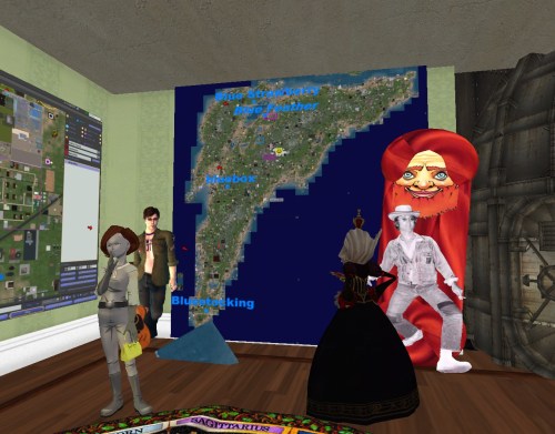 I must be forthcoming here to fully explain the oddness of the juxtaposition. Through Baker Bloch, I actually *did* rezz the Mykall Skall flattie in that corner of the Blue Feather but it was a spontaneous action on my part. I didn’t know the flattie would be projecting a strong image of Lennon. And I didn’t make the avatar from the day before show up just as I was positioning Lennon and the rest of the Beatles on the wall just up the stairs from him. I was merely rezzing stuff spontaneously here and there, going through my inventory. It was, as one could say, an *accidental* juxtaposition. But we know in the Blue Feather that such accidents are too frequent to be called chance. This is synchronicity again.