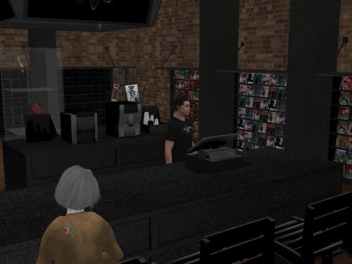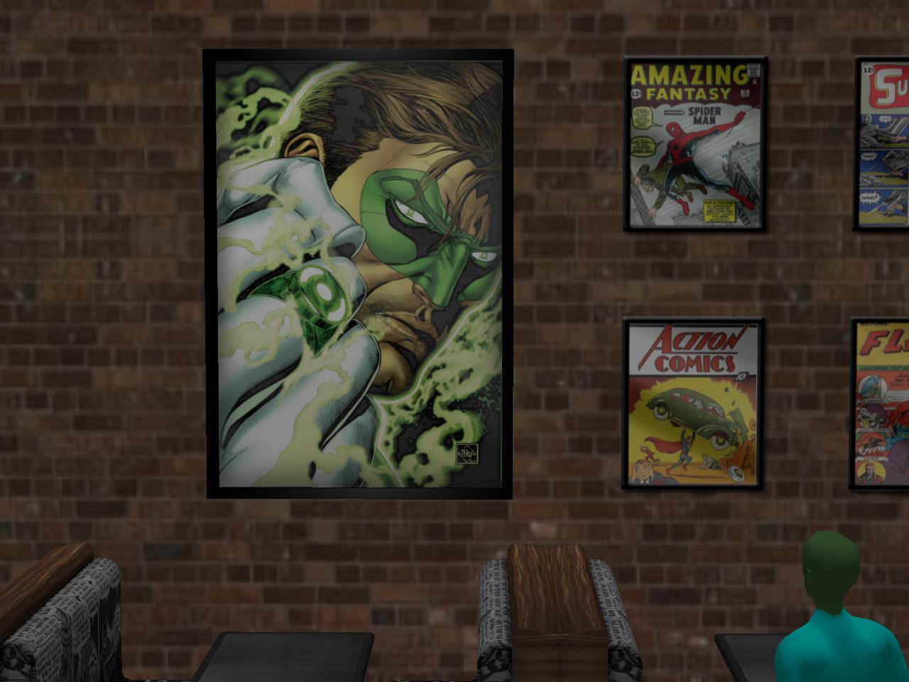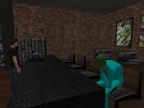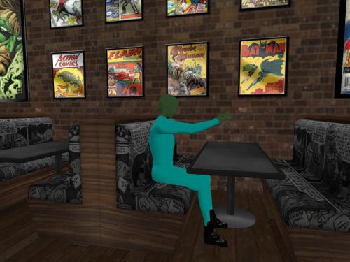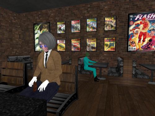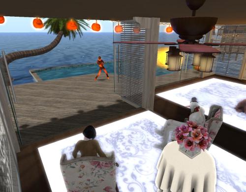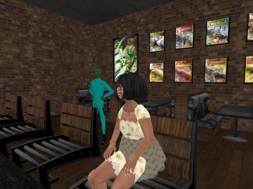 She wanders through an opening in a row of tall cypresses to this nice patio with a green table with green chairs set up for game playing. It begins to rain, then it begins to pour. She takes shelter in a roofed pergola and starts reading a proffered book…