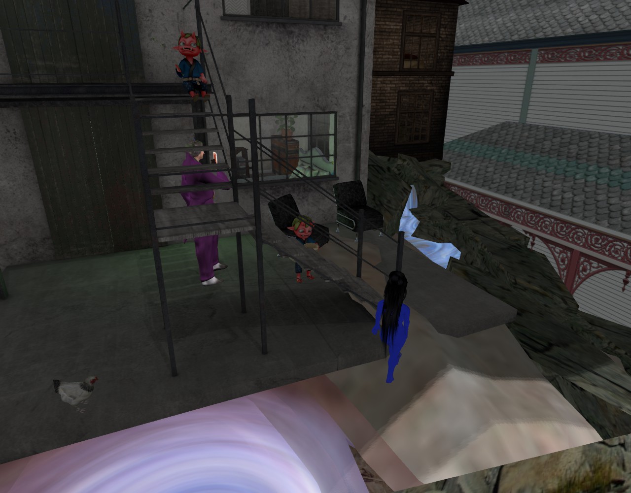 I was part of the Black Lake Bunch, also known as the Black Lake Gang or Purple Bunch. There was one in it who didn’t like me, didn’t approve of me. She said: why don’t you appear as you really are in this Second Lyfe of ours. She also mentioned the plug. I said the plug covers an avatar defect. I said it monitors the surroundings, giving me indication of friend or foe. Right now it was hurting like a mother fo. Red. Indication of foe. I moved away from her, unfriended her, even though we were never friends. Blocked I think is the word, yes. But the other remained kind of a friend, like Thatch. She was helping protect me. Red turns to green. The Alley is just across the way. There we find PROBABILITIES, exactly what I was looking for. An ESCAPE.