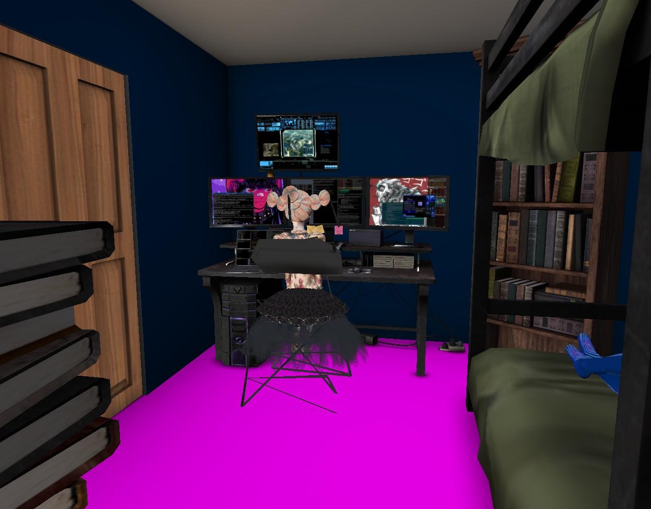 “It’s like this island, pumpkin,” Angus says, using the metaphor of the moment. “Right in front of you but not there atall — off the sim border in the Nothing Ocean. You can’t reach it now; out of bounds. But someday, sometime, we all have to experience this island, admit its reality. We have to cross a line.” He flips over and changes.