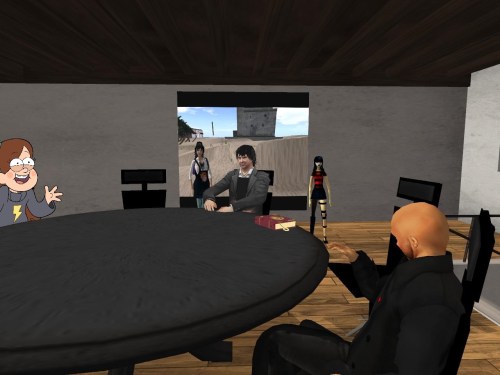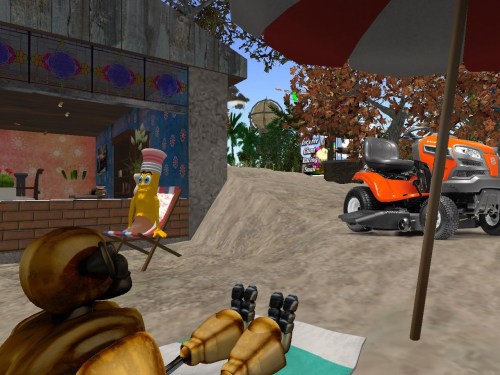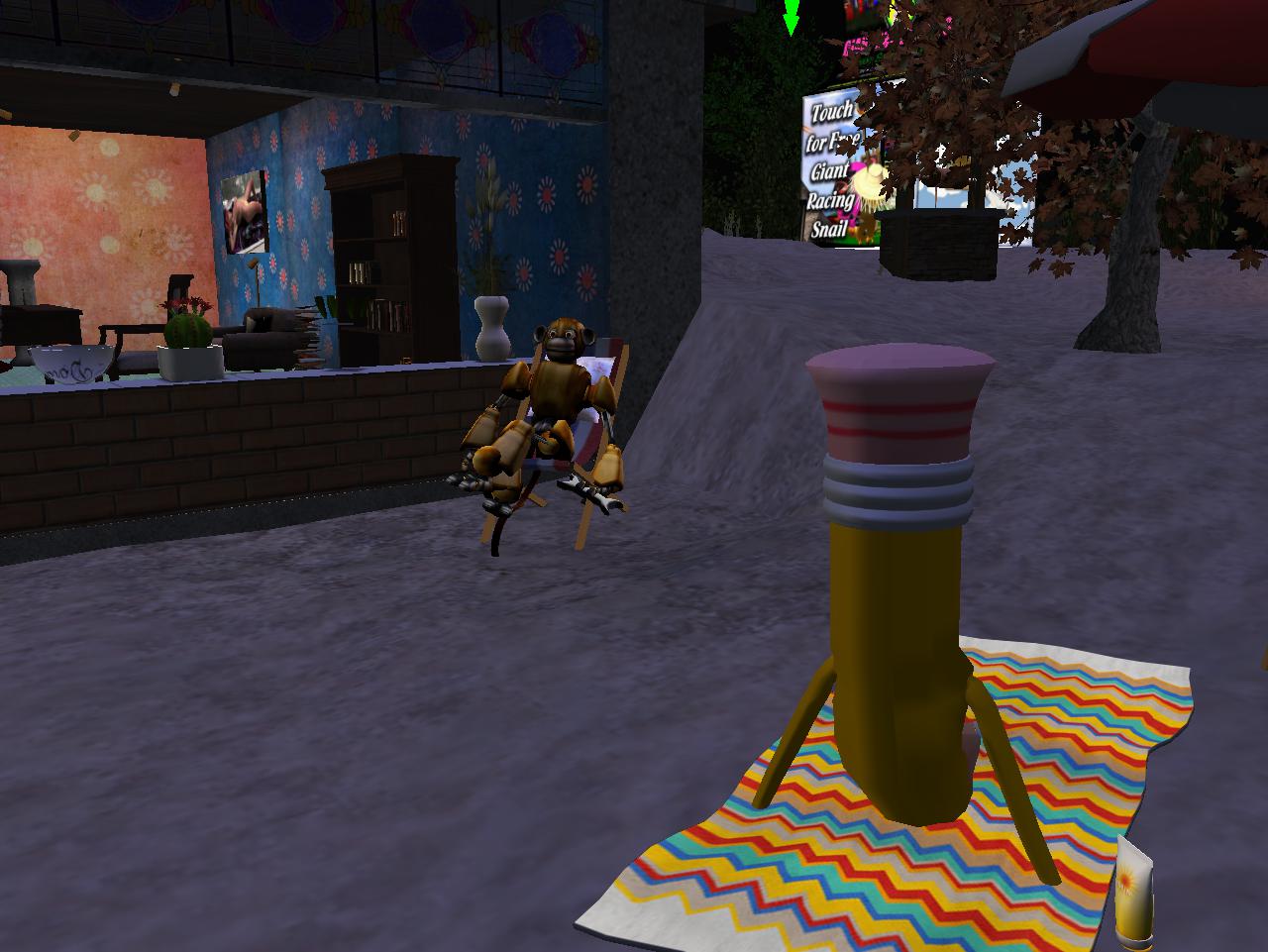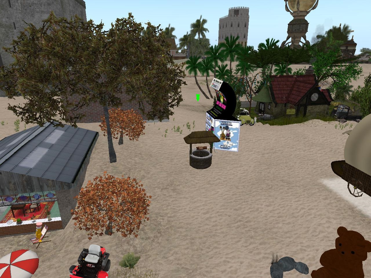 Which left center: Mabel’s house (Mabel and roommates Fisher and Bendy had seen nothing), Eraserhead Man and his Rabbit Hole house (nada again), and Robot Derak Jones (who said, check with Eraserhead Man, which she’d just done). Hmm, she thought, standing in the middle of central Route 9 dividing the island almost cleanly in two. She looked down at the buildings: Elephant Club, Axis’ Castle, Flossie’s, a new place beside Bumpy’s Ice Cream Village. “*Wait*,” she suddenly exclaimed. “The Village! I could ask Lavern Glam. She has eyes everywhere.”