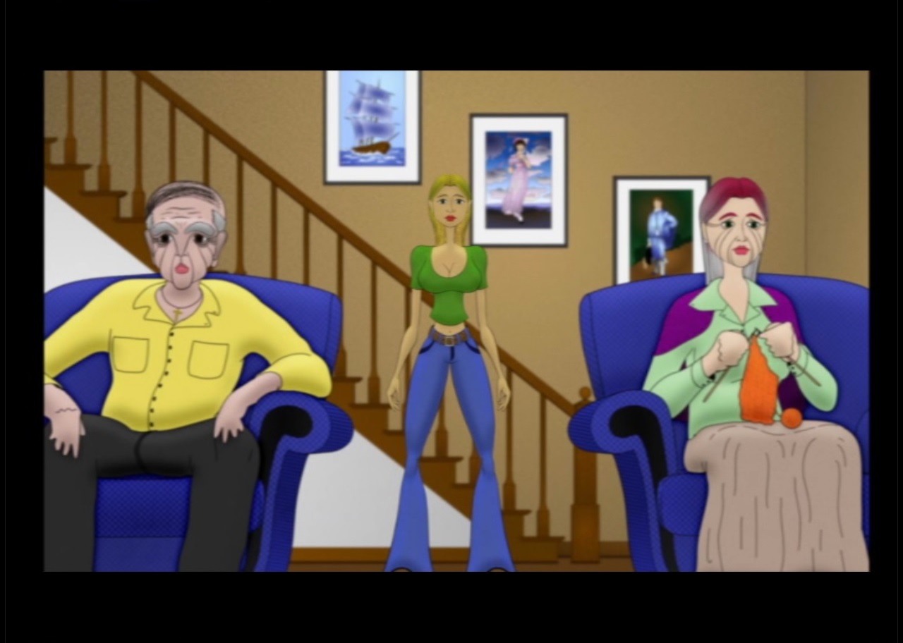 “Could be could be. I have to go to the table now. I have to make notes. Please don’t unfreeze the image on the screen here while I work over there.” He points backwards with his cane from his viewing chair, toward the kitchen we saw him sitting at with Frank and Philip a couple of sections ago. I don’t believe he’s shown up in this here blog and attached photo-novel since. Time to bring him back I guess. Oh wait… what’s happening? He’s now on the floor . He’s shaking… violently! Frank… do something! Move the table and its contents to start! TBC