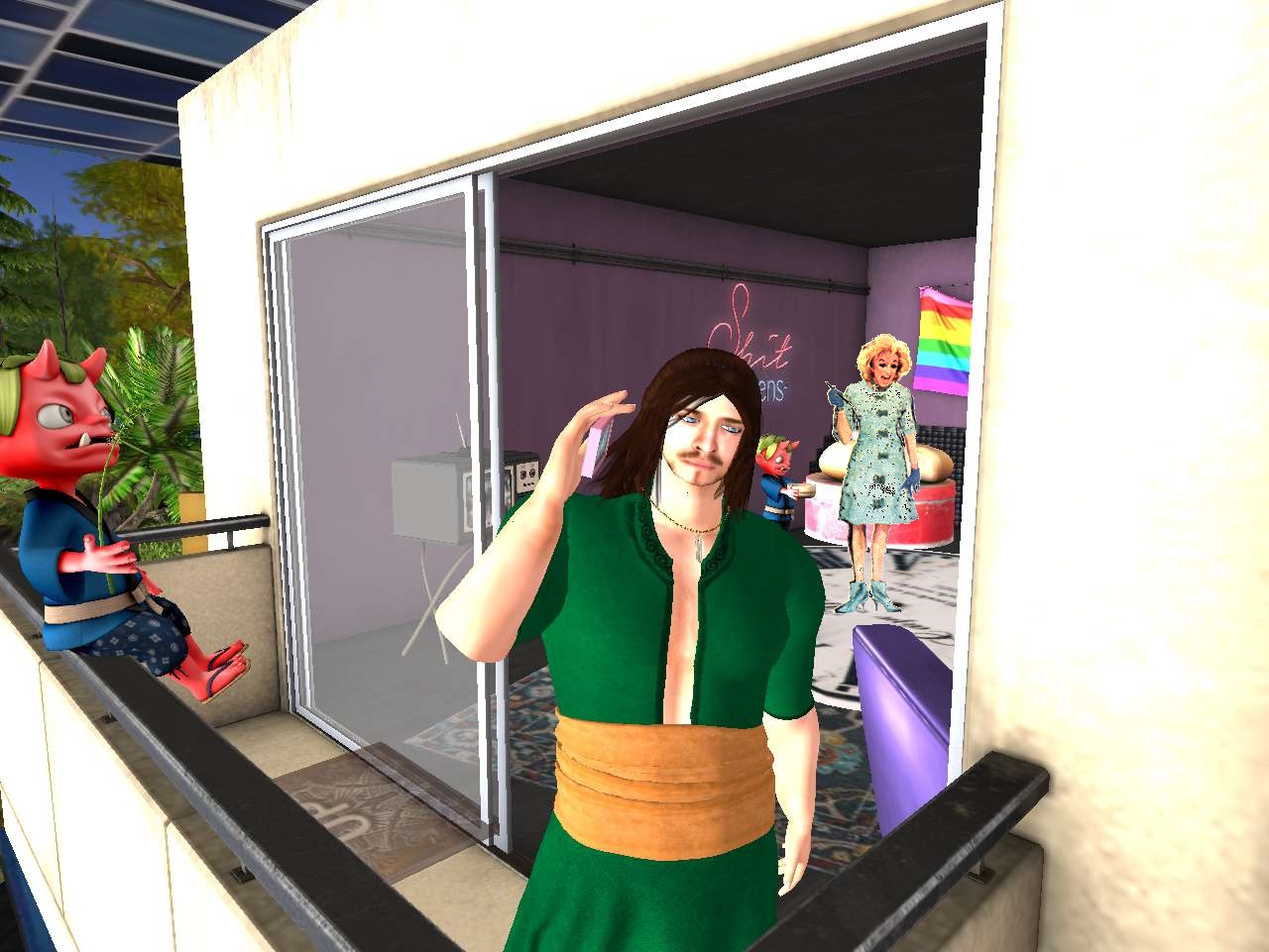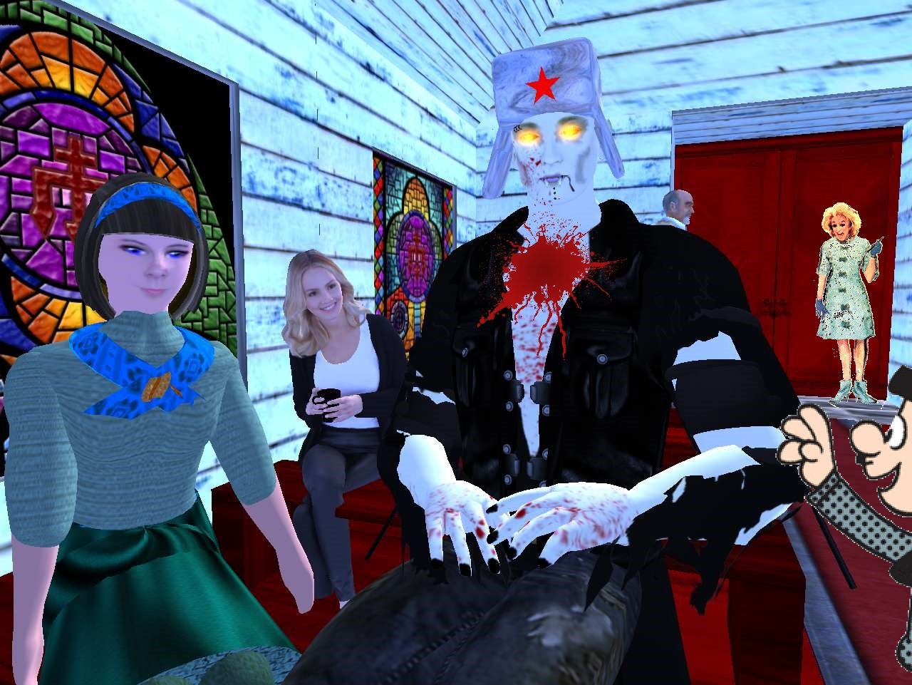 Al leaps back up to the balcony and into the room. “Done,” he says to Phyllis. “Threw it over into the graveyard next door to be eaten and disposed of by the zombies when they awaken tonight.”