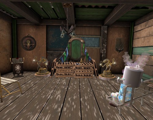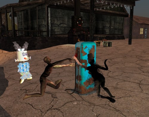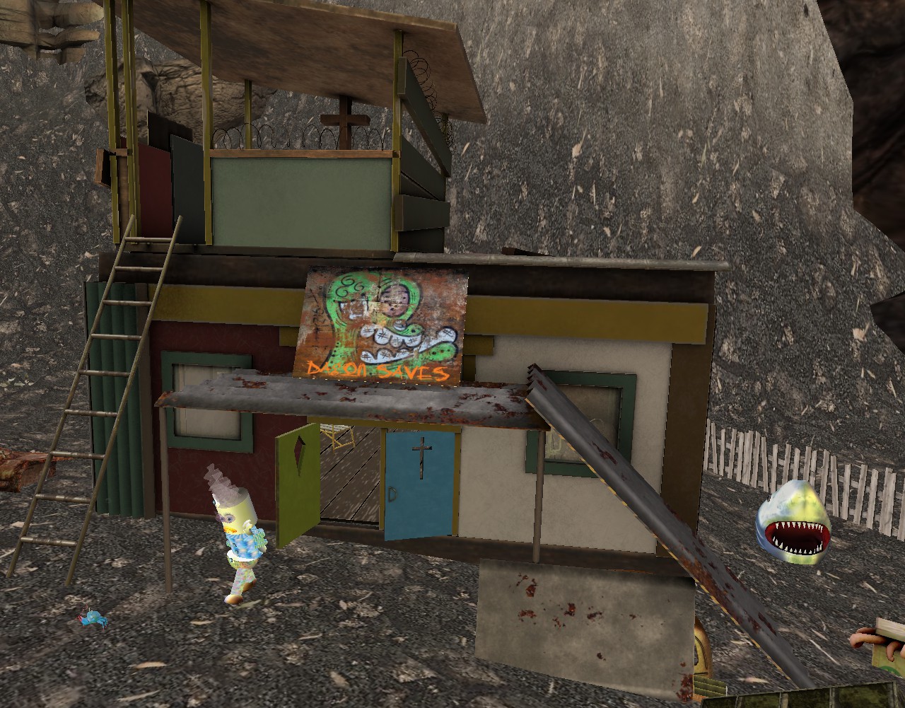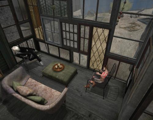 Like Laura and Clemenesta behind them, they were staying at the Foxy so-as to be close to church and emergency worship sessions, etc. Because definitely their soul needed to be saved, they felt. Jesus let them down — was cut off — because he and his clan were missing the 4th, the yellow some say, others: green. The 4th is the shadow, the thing not wanted to be dealt with. Yet all 4 embraced it; began having private TILE meetings in the old Video Days Rental building where it all started, over in the Black Diamond part of town. Never mind that the place now sells tattoos. Definitely part of the magic! 100 lindens per week rent well spent, especially split between the lot of ’em. A secret door connected the 2 parts.
