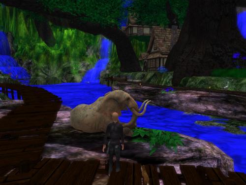 “There’s your old pal Ellie, Scotty. Same as always. Guarding the bridge. Impart your experiences to us, my long memoried friend.” Ellie duely sends Sikul a notecard summarizing what’s happened since his last visit. “Thank you, that’s very gracious, Ellie. I will study and absorb when we reach the village and are able to rest. Oh, but I see from just scanning the first paragraph of your note that the village has been damaged.” Ellie raises her head and unfurls her trunk. A loud hiss follows. “Hmm, we better get there post-haste. Goodbye Ellie. Say goodbye, Scotty.” Scotty barks several times at Ellie and wags his tail.