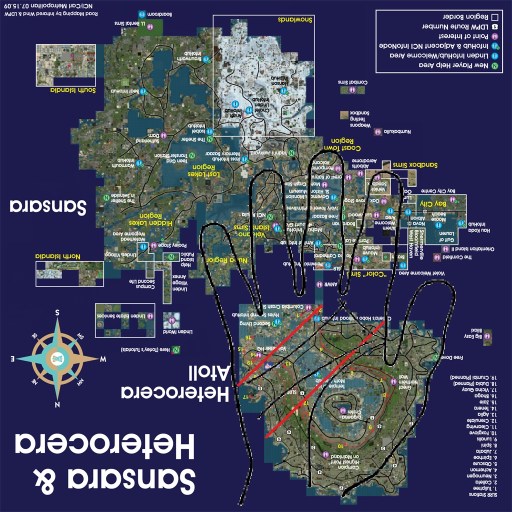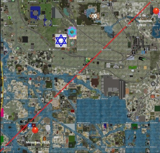 “Yes,” spoke Baker Bloch not quite as enthusiastically. “Anyway, both sightings occur very close to our brand new Heart Line. The actual heart shaped dance stage in, let’s see, (Baker Bloch looks at the part of the map closest to him, its sw corner) Catocala — never remember that — it marks the line as the Heart one. Then just a bit later I found a linden palm right on the line in one of the sims below this map, but didn’t make the connection to *palm* or hand line until a little later. Then the spinning train in (Baker squints further up the map this time), Velox — yes, Velox — convinced me this new Diagonal also had power, just like the old one running through Rubi and VHC City and the like.”