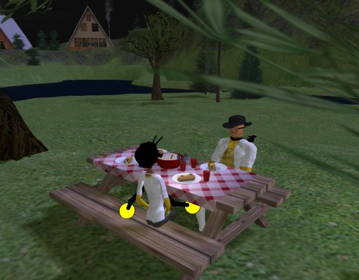 “Not really. Oh… and cole slaw. Big tub of it. Aren’t our Lindens wonderful? Free food. Beautiful location. Heart Lakes I think I’ll call this place. Not Tam Lin.”