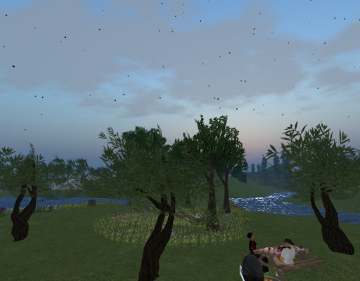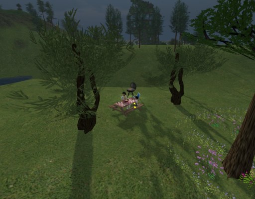 “Baker Bloch looks around. There’s mossy hills in every direction here it seems to me. Over there. Over there. Then also over there. Mossy Hill (sim) doesn’t really have any hills. But this duplicate sim with the additional heart lakes and also this picnic table and some other stuff does. I think this is the true Mossy Hill sim, Hucka Doobie.” He pointed again. “Here, here, and here.”