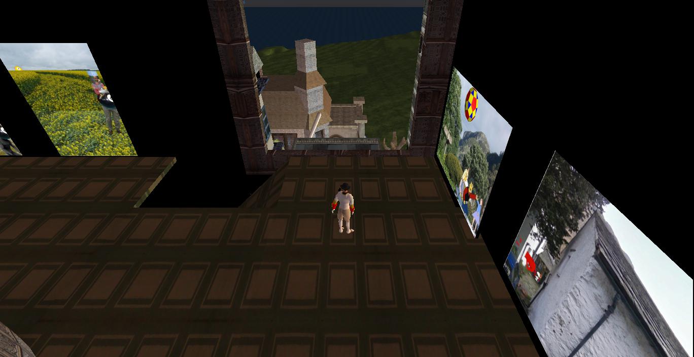 Below we have a picture of the center of town, a more open space surrounding its lone stream. Another comparison with VWX Town can be made here, since Collagesity’s stream is itself a *collage* or mashup of the several stream flows appearing in VWX Town. I’ll have more to say about that soon as well, I’m guessing.