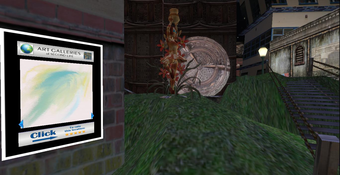 Next we come to the reincarnated clockwork ballerina, now positioned just above the mysterious firey beginnings of Central Stream. Originally there were 2 twinned red flowers around her, but only one remains. At the time I associated them, and the ballerina, back to the Grady Twins from The Shining movie. Just to the ballerina’s east is the town’s art kiosk, a portal to and from the outside virtual world, as it were. What means the removal of one of the 2 twinned flowers, if anything? Again, this seems associated with Rubi’s VWX Town, where the same ballerina appeared at the confluence of that town’s 3 streams. Once more it acted as a center. She doesn’t have her 3 blue hoops this go around, nor the pool and the matching 3 (hooped) blue fish.