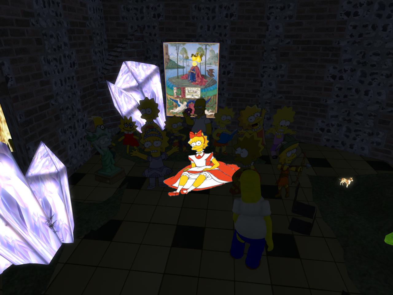 “The Lisa dressed up as Alice in Wonderland lights up now, Homer, the famous fictional character who indeed fell into a hole, a rabbit one. Yes this is about the hole, or that’s where it started. I’m not sure how you wandered from the real world into the Rubi Woods but that’s how you got here. You’re not like your family any more, Homer. You’ve added a dimension. Do you remember The Before, when you were an animated flattie?”