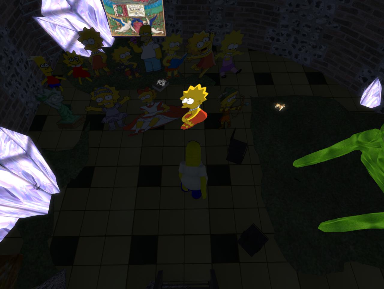 In other news, Carrcassonnee actually *did* walk out into the woods from the town stark naked, as Karl thought he made up. He’d really heard it from Karoz at the bar late the previous night, forgot it, and then twisted up the facts the next day in relaying what he perceived as a fictional story to Homer Smipson. The energy from the woods still has a way of scrambling your brains like that. In truth, Carrcassonnee (who is *always* “naked”, by the way) was testing out the new town shower set up by The Bakers in the 7th spire of Castle Jack right next to Karl’s bar, a most sacred place indeed now. It was a tight fit for the great olive being, but she managed to jam in and enjoy a most pleasurable shower indeed, the best she could remember. But toward the end she’d gotten some soap in her eye and wandered out of the spire through its now phantom prim and into the woods to the west, searching for a towel. Karoz saw her from its edge but was tied up at the moment, unable to help.