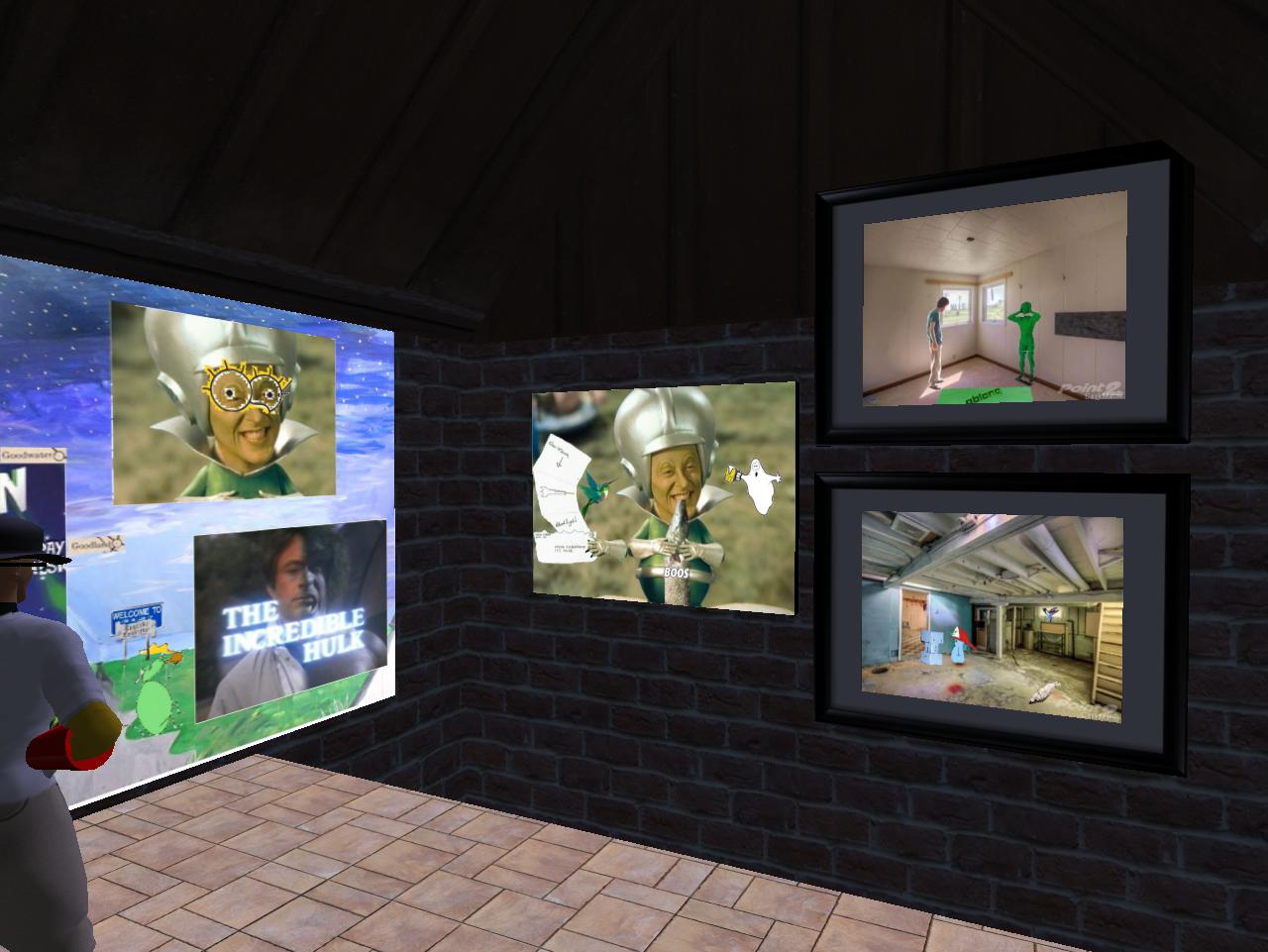 Avatar sitting on a prim depicting two bird shooting motorcyclists. This is, of course, a still from the legendary British sci fi comedy series Red Dwarf. You did know that, didn’t you? It’s cleverly positioned within the Hipper rez zone of the North Sea. The avatar merely rezzed the prim and then sat on it to keep it from derezzing. He can sit there as long as he likes. However, upon standing up the prim would instantly vanish.