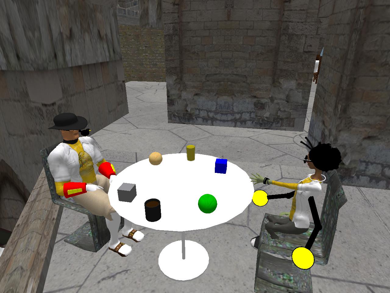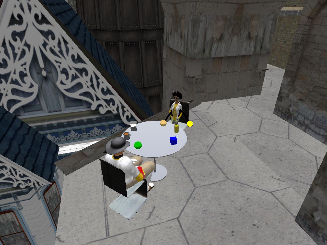 “And then, let’s see, this green sphere is Mmmmmm Salad Bar Jack, who stands in for Lemon. Well, he’s actually done some kind of mind-body meld with Lemon, who, being a flattie and all, can’t really sit at The Table. So that’s Salad Bar. And opposite Salad Bar is Hucka Doobie. I’ll just rezz a plain sphere for him.