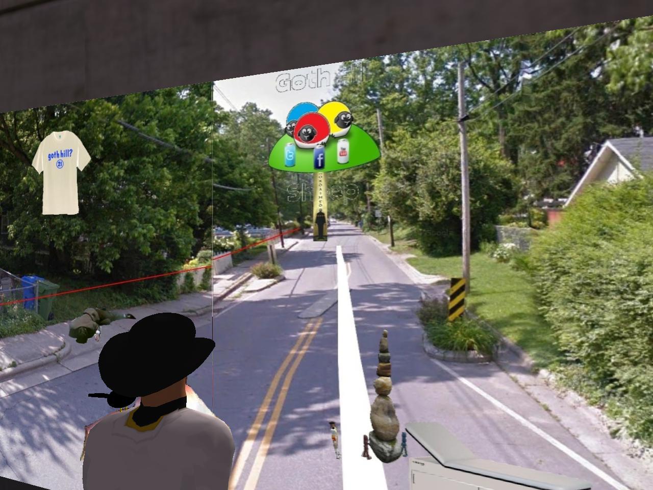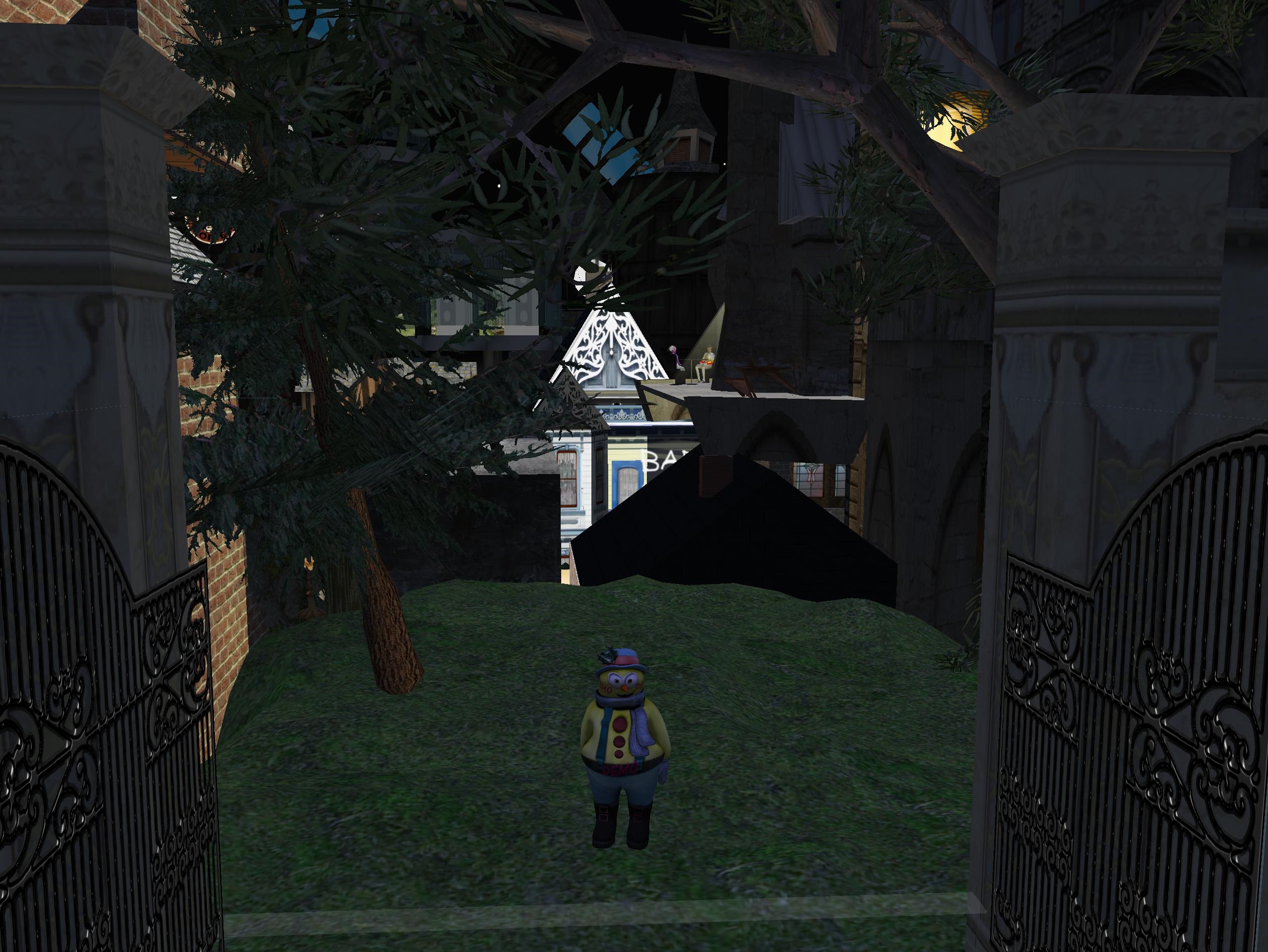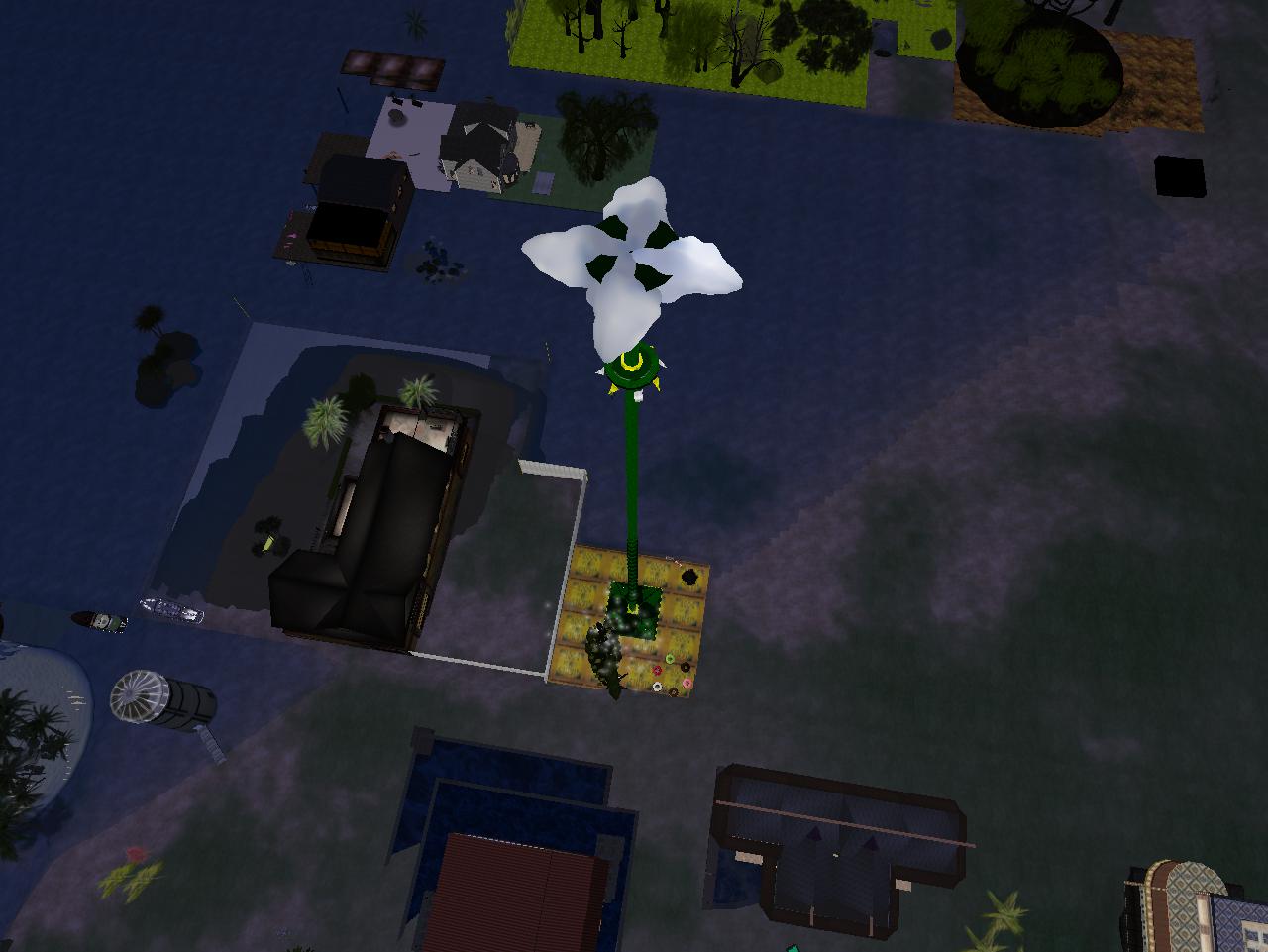 Next she found a parcel called “Giants at the Door Band”, not far from the center of the sim where a *giant* (i.e., Brenda) had arrived just days before and helped opened a door or window or something into the room where Snowmanster apparently burned to death. She enjoyed their green and yellow beanstalk ride while there, which shot her up about 120 meters to a cloud with no giant atall inside. Still quite fun, and, besides, she knew who the *real* giant was, even if said giant didn’t know who *she* was any longer. A very strange turn, but one of many currently going down in Collagesity now. Here’s the Giants at the Door band’s facebook page:
