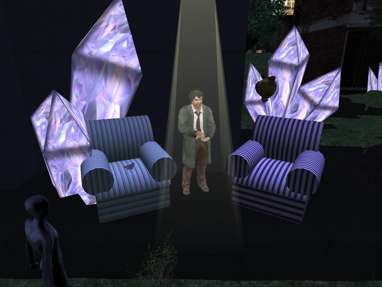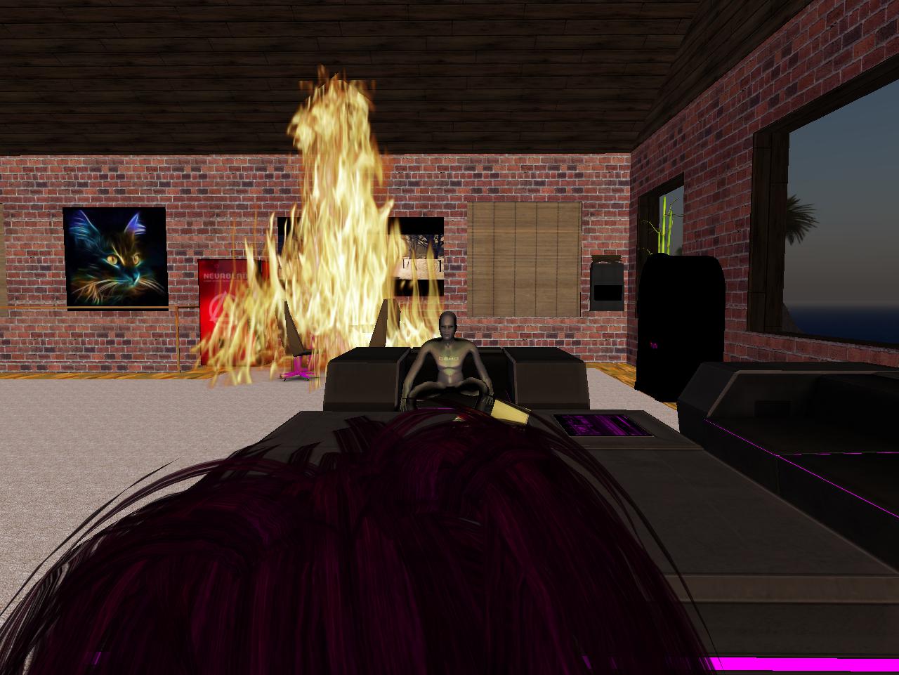 “Yeah, we’ve known something odd was going on (in that direction) for a long, long time Mr. Owens — Kenny. I might as well start calling you Kenny since you may be staying with us a while. The main question for now is: why did the giant female show up in the middle of the sim in question and play a game of roshambo with the tiny Minoan who is now Old Mabel’s good friend? Then why did that somehow open up a door or window or something into the place beside the motel you were staying in and allow (us) a glimpse into the firey death of Snowbob’s poor mother caused by this Jerome fellow? Who is Jerome T. Newton? He’s obviously a killer. Then there’s the burnt-to-a-crisp cow across Robin Lane.”