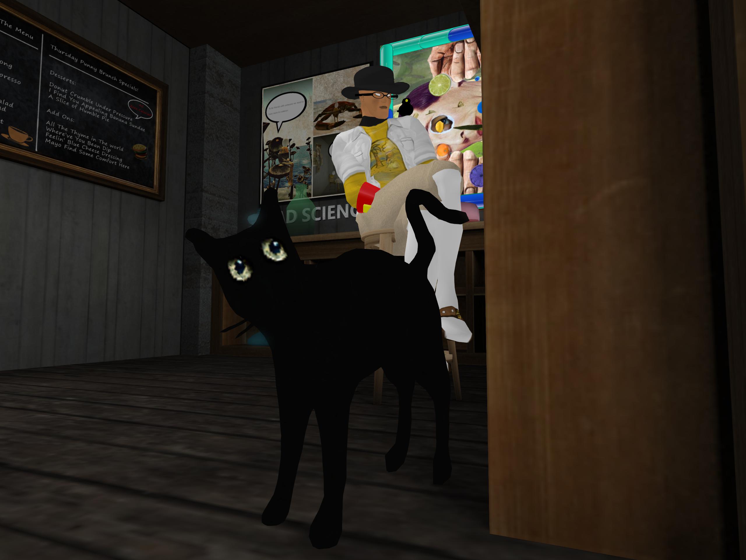 Ch-ch-changes (sorry) at the epicenter of the Jorondip sim once more. My new friend Quito has given me a present! I wonder if he noticed the pictorial similarity between Quantum Cat and Starman David Bowie seen on the sides of his namesake arcade game? He probably did. They’re even about the same size.