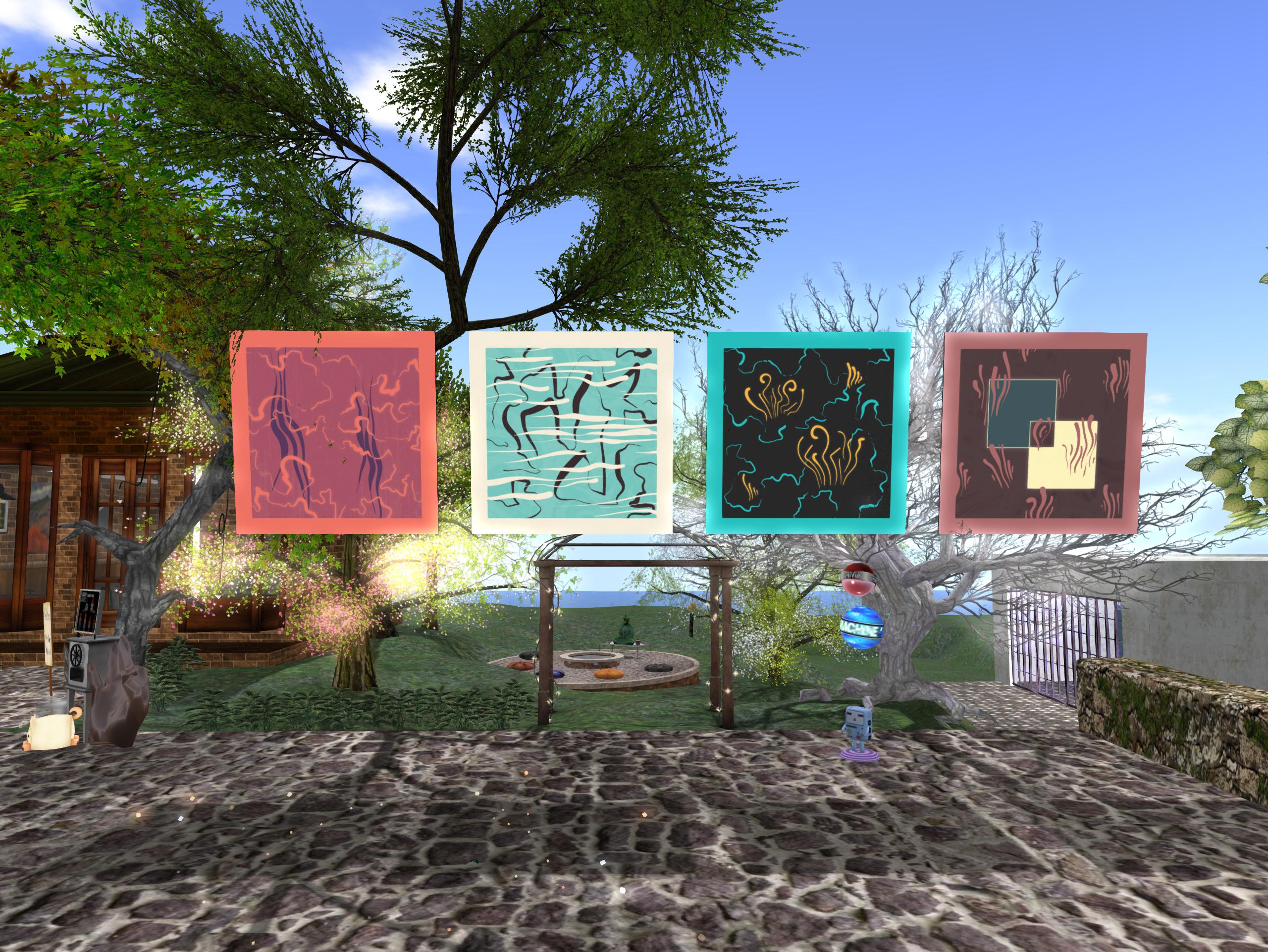 The owner here is — yes, Art Oluja again. Next door is Saul’s Place Cafe, with a display of Saul Goodie’s very interesting abstract art pieces. Whether chance or not, this is also quite near Soujourner’s Grounds. Just down Route 8B. Is this the start of some kind of art city along this route? Only a couple parcels of abandoned land separate the two. And I should also add this: “Art and Weird Words” is found in a sim called *Wyrd*. Wyrd is a type of portmanteau of “weird” and “word”. Interesting!