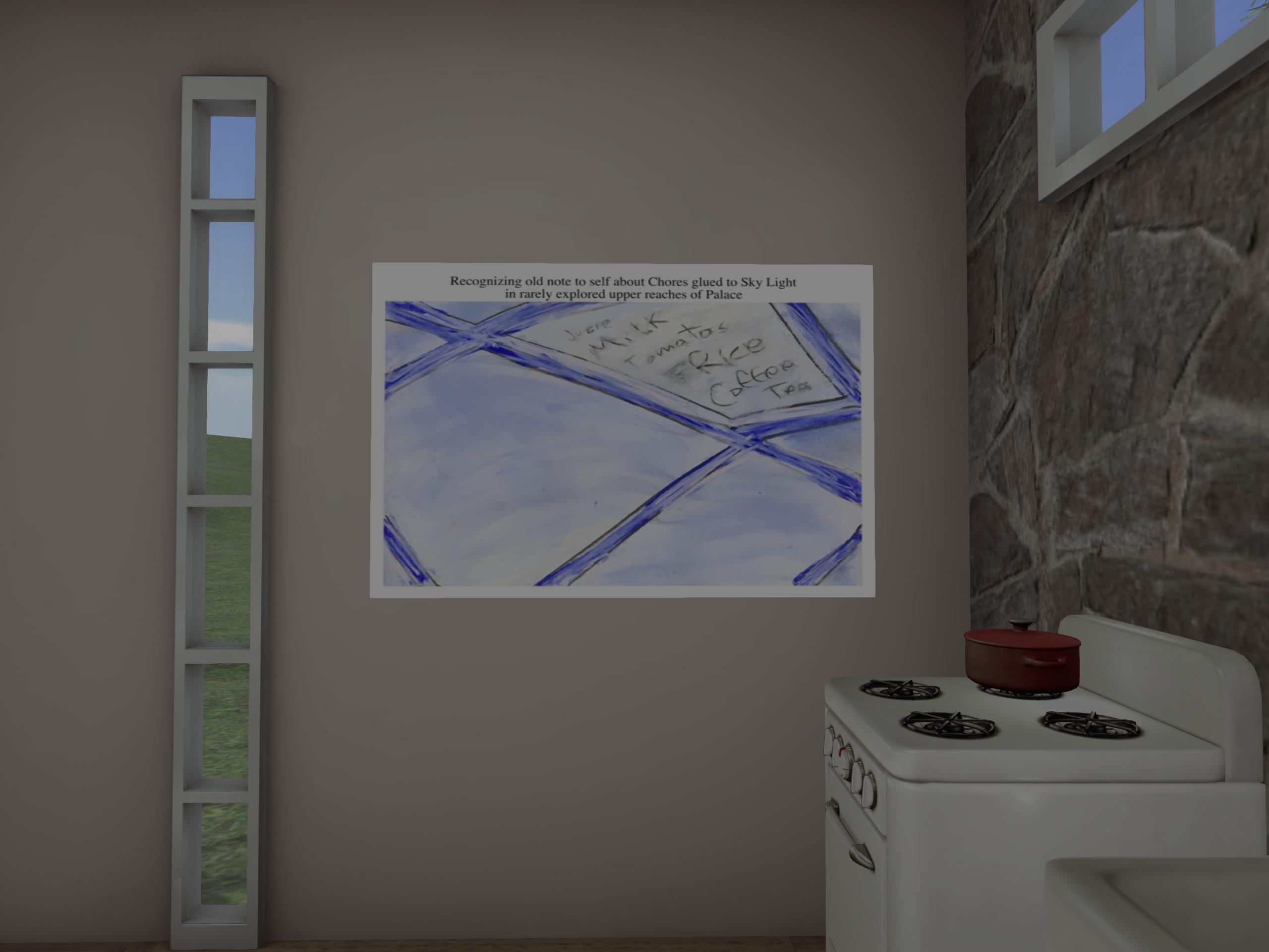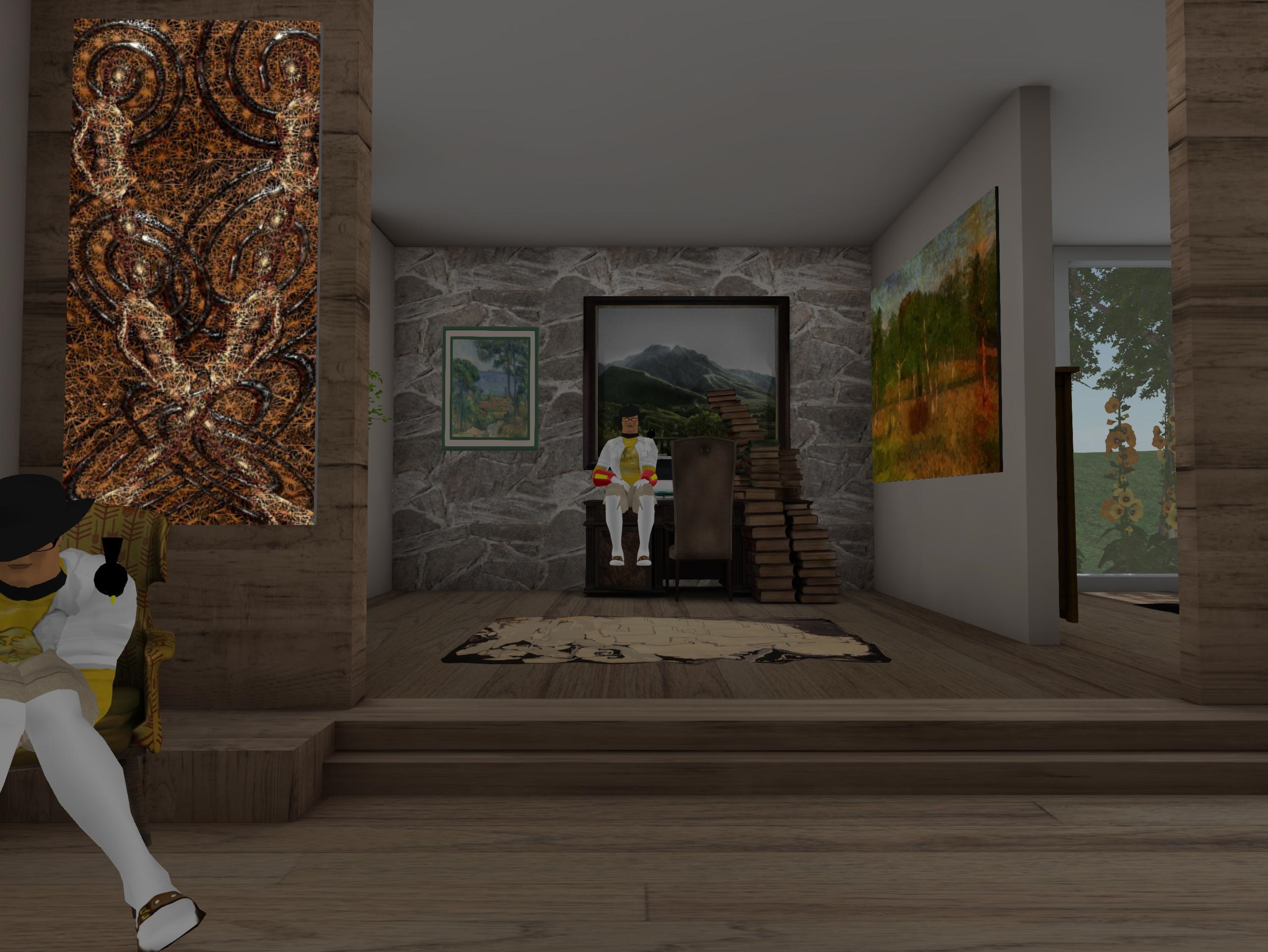 Which leads us back to the makeover. It was decided — again, a family decision — that Baker Bloch was just a little too archaic looking to function as a fully proper art gallery promoter to the larger Second Lyfe community. Another friend at the time that influenced the change was Flora Nordenskiold, who later became a powerful and influential Second Lyfe gallery owner. But when we were friends, her ascent was just beginning. We thought we might mimic her style, and open up our formerly private galleries for public shows. But this phase of our existence was soon over. Another branching off occurred. We decided that the Blue Feather Gallery in Noru would be both enlarged and set back on earth — grounded — to sever as a vehicle for the ambitious “Jeogeot Through Art and Word” exhibit, another personally made one. The idea was to unite the art of *all of Jeogeot*, Second Lyfe’s largest mainland continent, and create a unified, collective style of sorts. I think. Again for this, we had cursory approval from the higher ups in Chilbo, I believe. And looking back, I think Chilbo could have greatly benefited from a stronger link with the idea. Again in retrospect, Chilbo was attempting to expand LINK, but never made it past a local effect, really, in terms of overall Second Lyfe culture. As Hucka D. kept reiterating at the time, Chilbo goes as Jeogeot goes.