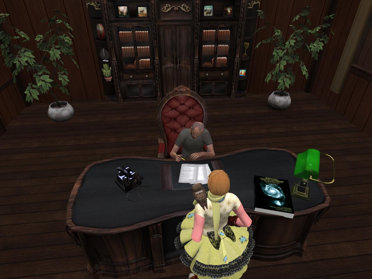 “I see, Mrs. Brighton,” he says calmly for the set up. “But *no*, we cannot lend you 10,000 lindens so that your little boy can get out of jail. You can see him in 10 years!” He slams his hand down on the desk to punctuate the idea and then laughs heartily, head tilted backwards. He laughs so hard his sides start to ache. He must be careful.