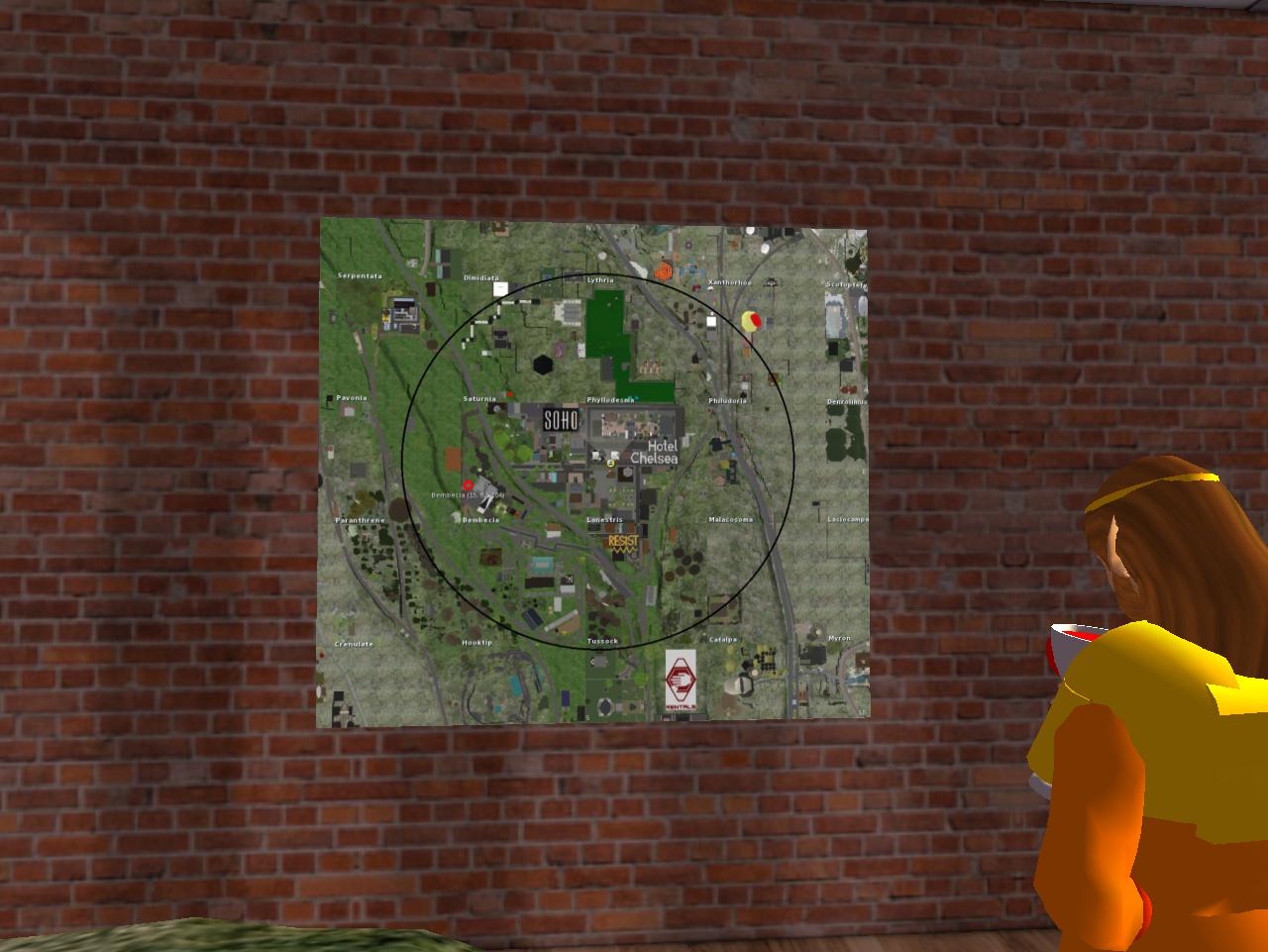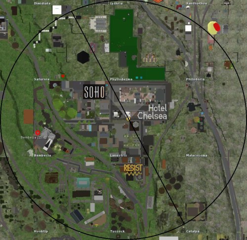 While in the heart of VHC City, Baker decides to redraw his Sphere of Influence map accomplished earlier in the day with a new and hopefully better center in mind: Sister 64/128. 1/4 the way across the sim. 1/2 the way up.