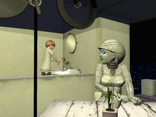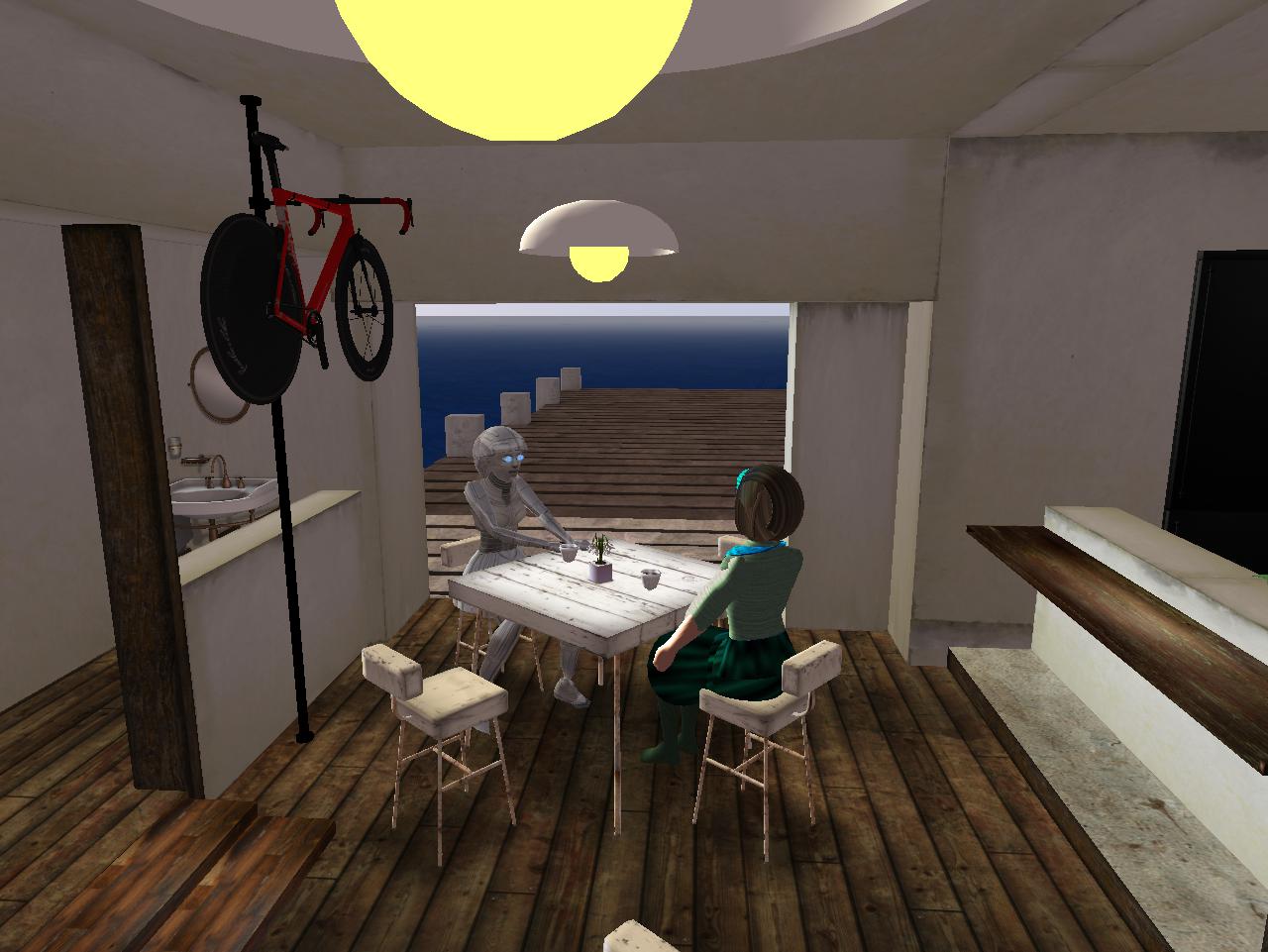 They’d made it to the Telea-Rustic Bridge and were sipping coffee at Garage La N in Hagen, the sim between namesakes Telea and Rustic containing the middle bulk of the span. This is the same cafe that, earlier in the month, Tronesisia and Bendy had (to her) fallen a bit in love with each other on their way to Collagesity and the rocketship he said would take him back to his real home in the skies. Pitch had insisted Mary/Chuckles accompany Tronesisia for what he called this “insane mission” to find Bendy on The Moon of The Moon and try to talk him into “being lovers or something.” It was a good move on his part; fate, we could call it. For Mary revealed something in that cafe which began to change Tronesisia’s mind about the trip. Let’s listen in.