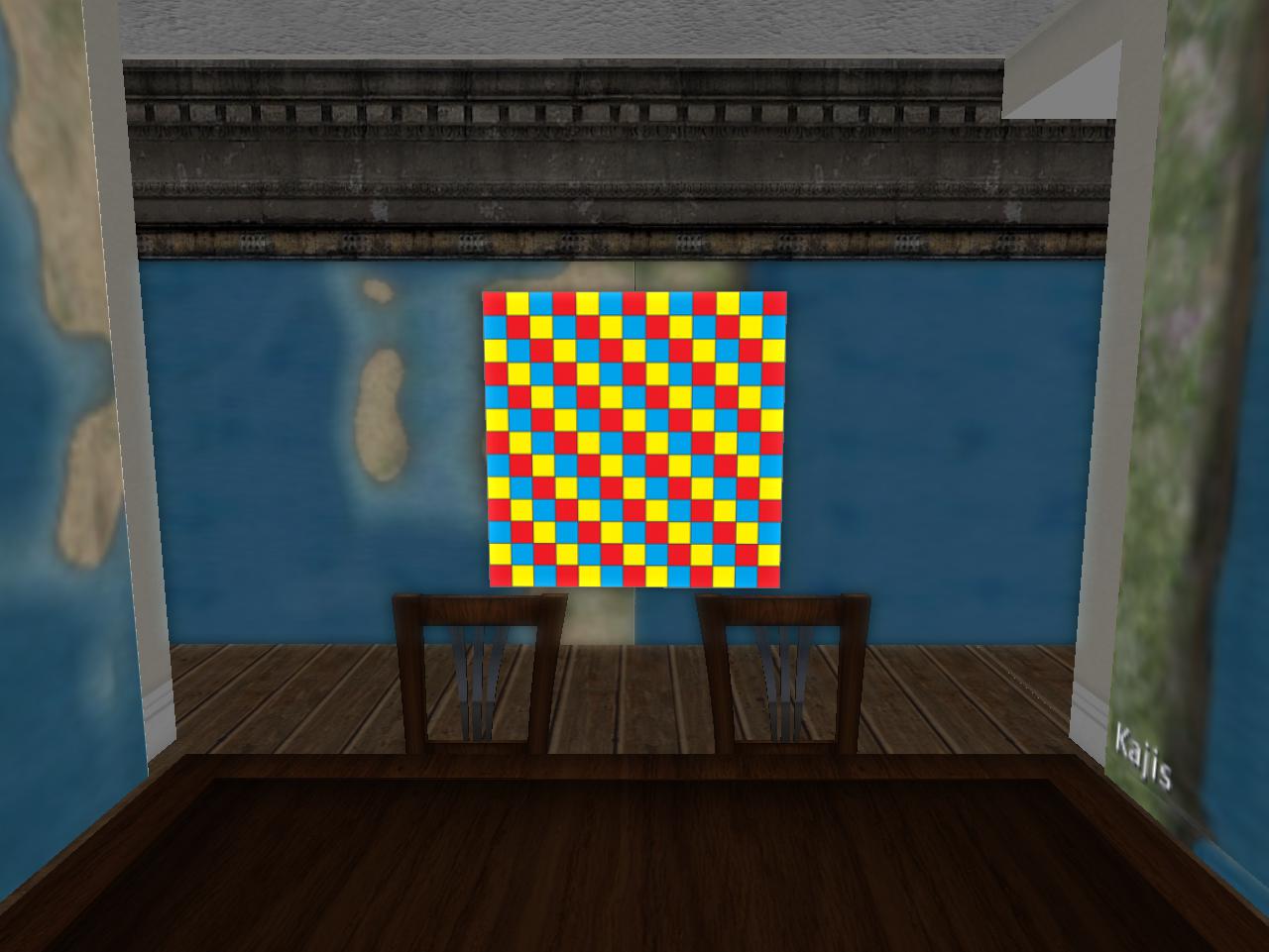 … Jharmelion behind. He’s read the rental lease a couple of times now. Paraphrasing, it states that you are to leave the Korean Channel wall maps intact and also not cover the *land* parts with furniture or decorations or risk facing a fine. Water’s okay (minus the sim titles), and why he can get away with repositioning his media player atop the totally liquid Qui Quon. No solid ground atall in that sim. He’s pushing the limit, though, with Jharmelion and the couch he sits upon — right against the shoreline.