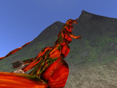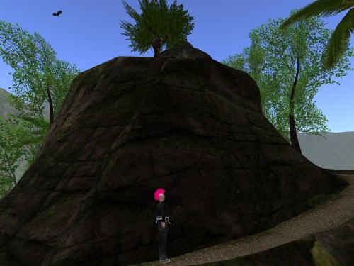 Perspective enlarged, Chuck Cheese finds herself in a strange place again, walking on a spiraling path upwards toward a rocky summit.