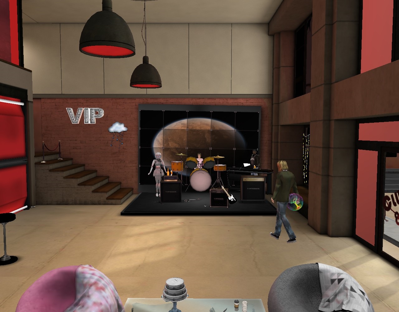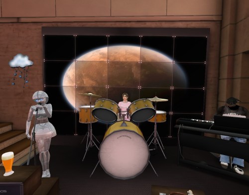 She sat at the drum kit, calmly waiting while the singer and keyboardist remained frozen around her (like planets).