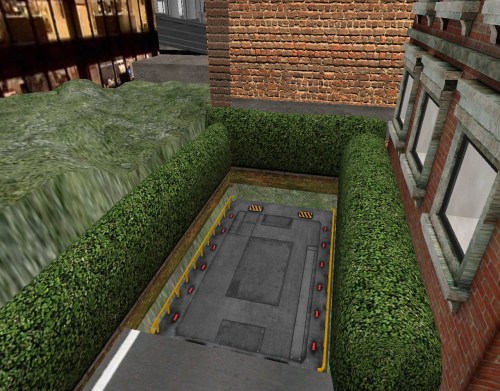 A lift directly behind the rowhouse just rented that goes down to nowhere. Just grass beneath here. The megaburg is still being built in its various levels; a work in progress.