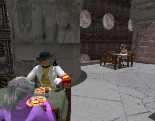 “… nice view of Carrcassonnee’s new, blooming tree over at the Temple of TILE. I think this could be our new spot, Other Baker.” He woofed down another delicious piece of Raggedy Ann’s pizza with this. “This — um so good — this new pizza item is the *best*, Baker Blinker.” He takes yet another bite, and talks, still with his mouth pretty full. “Ginger, yum (*chomp*). Just a hint of ginger.”