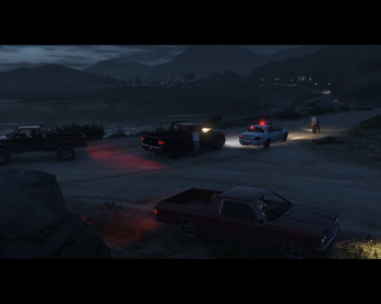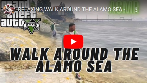 … where later in this same video, the maker, through his chosen avatar of Trevor, parks this same intact auto, a red Chevy El Camino as I’ve checked, to witness a crime being committed resulting in several shot people, perpetrators and cops alike. This is where he decided to peel off from the Alamo Sea loop and not complete what the title alluded would happen. *Around* the sea, it said. Okay, disappointment, but the guy was a freewheeler as he freely admitted a number of times in this and the other GTA V video he’s created that I found online. Anyway, *we* indeed intend to complete this loop, if on foot if not by car — which might be better anyway; can look at more details of the sea itself — through another video which hopefully stays truer to its very similar title. This one. We want to get an in-depth look at this Alamo Sea, dive into the subject matter as it were. I’ve honed into it as a place of special significance to this blog and attached photo-novels, 45 being the present number we’re on. What secrets does it hold underneath its gently waved water? and so forth. Circumnavigation first, though. *Hopefully*.