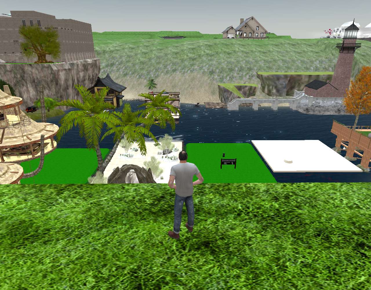 Nevertheless, I have a new area of interest on the Jeogeot continent: its largest inland sea with an interesting little town to its northeast called Juho (where Trevor/Philip is pictured playing around above) and another large region to explore to its east — directly se of Juho — named Scire Gaea Park, an older and more established set of linked parcels. And that’s just what I’ve found so far.